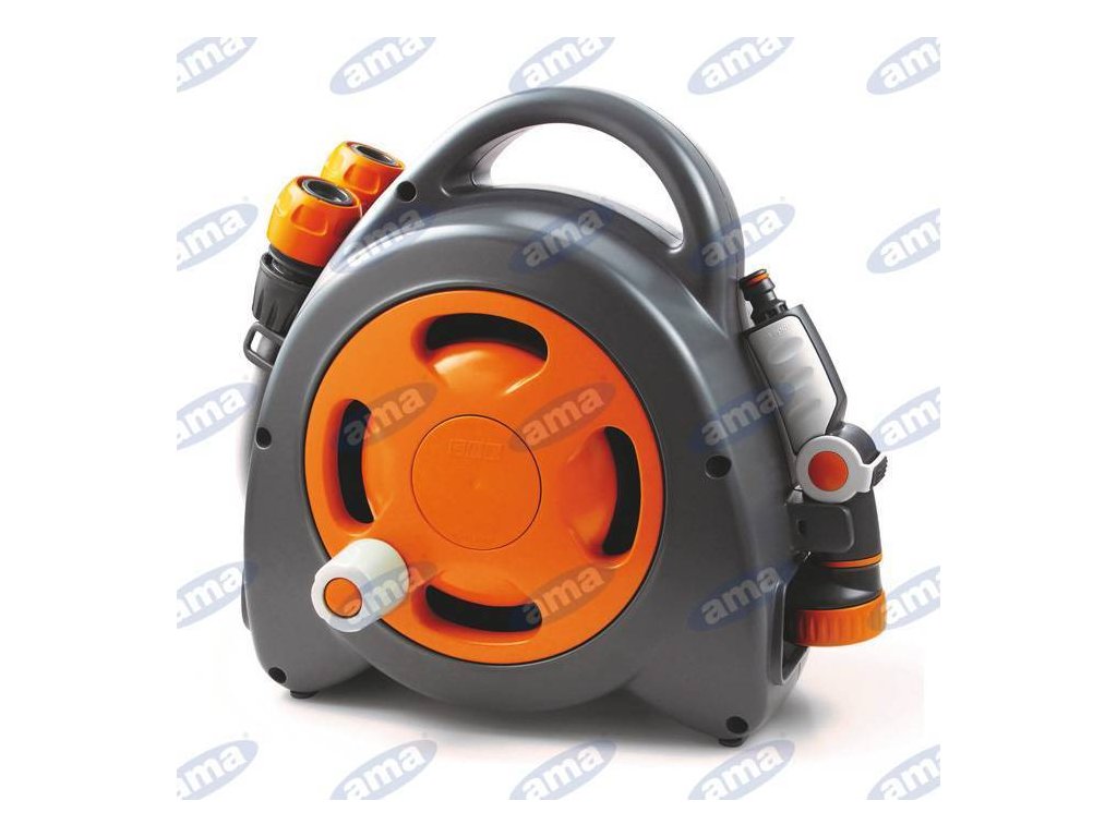 Aquabag Schlauchaufroller ausgestattet mit 16-5 m flexiblem Schlauch (15 mt einziehbar 1,5 m außen) 2 Anschlussarmaturen, 8 Sprühstangen, Innen- und Außensteckdose von 3/4