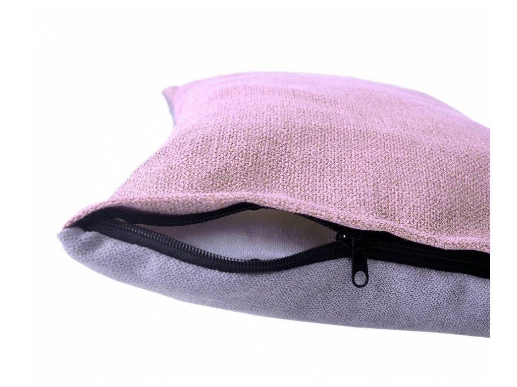 Abnehmbares doppelseitiges Kissen mit Reißverschluss. Rosa Stoff auf einer Seite und angenehmer grauer Stoff auf der anderen Seite.