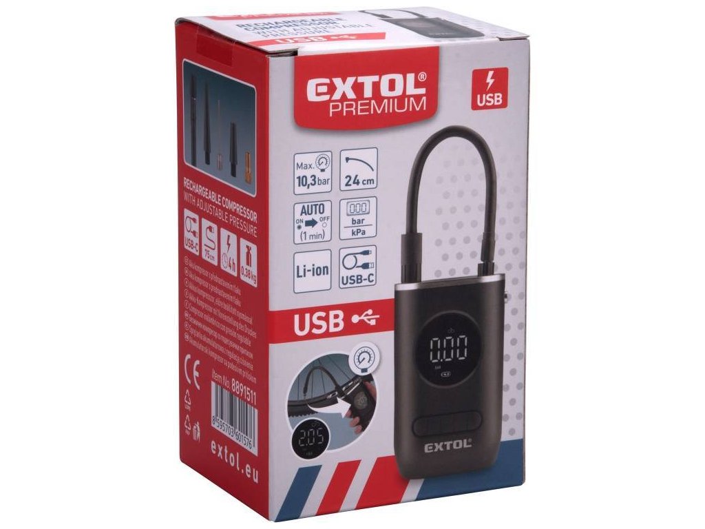 Der wiederaufladbare Reisekompressor mit beleuchtetem Display wurde entwickelt, um Fahrrad-, Motorrad- und Autoreifen auf den vorgeschriebenen Druck zu prüfen und aufzupumpen oder um Sportbälle, Liegestühle, Matratzen usw. aufzupumpen. Die Bedienung ist sehr einfach - Sie stellen den gewünschten Druck am Kompressor ein oder wählen einen der voreingestellten Werte, starten ihn und warten dann einfach, bis er aufgepumpt ist und sich abschaltet. Der Kompressor hat eine Größe von 13,5×8,5×5cm und ein Gewicht von 380g, so dass Sie ihn problemlos unterwegs mitnehmen können. Das hintergrundbeleuchtete Display und die LED-Beleuchtung, die separat und unabhängig vom Kompressor eingeschaltet werden können, erleichtern die Verwendung des Kompressors im Dunkeln. Wenn er nicht benutzt wird, schaltet sich der Kompressor nach einer Minute von selbst ab. Mit einem USB-C-Anschluss kann er an jedem USB-Ladegerät aufgeladen werden, egal ob es sich um ein herkömmliches 230V-Ladegerät oder ein 12V-Autoladegerät handelt. Dank der Li-Ionen-Technologie können die Akkus jederzeit wieder aufgeladen werden, ohne dass sich ihre Kapazität verringert. Der Li-Ionen-Akku verliert nur sehr langsam Energie durch Selbstentladung und hält lange Zeit geladen und einsatzbereit.