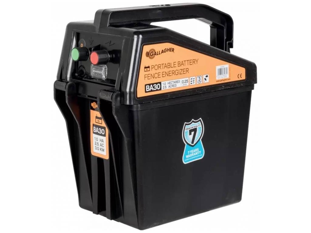 Weitere Informationen: Mit dem Akku-Netzteil BA30 können Zäune mit einer Länge von bis zu 4 km betrieben werden. Das Gerät ist äußerst robust, hat ein spritzwassergeschütztes Gehäuse und ist dank des oberen Griffs leicht zu tragen. Das Gerät ist mit einer grünen LED ausgestattet, die anzeigt, ob das Gerät in Betrieb ist. Der BA30 hat einen eingebauten Blitzschutz und wird mit einem Satz Verbindungskabel geliefert. Empfohlene Trockenbatterie: 9V - 55 Ah (nicht im Lieferumfang enthalten) Technische Informationen: - Empfohlene Anzahl von Erdungsstäben: 1 x 0,5 m - 9V-Batteriepack (nicht im Lieferumfang enthalten)- Kann mit dem Kabelsatz 00711857 auch mit 12 V betrieben werden