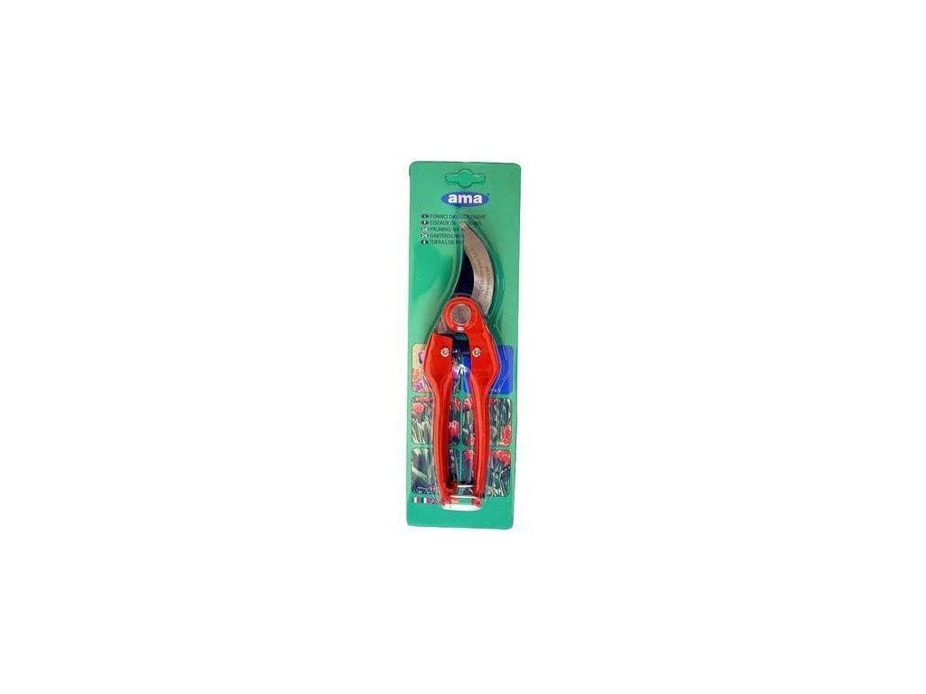 Professionelle Gartenschere 220 mm lang mit gebogener Klinge aus hochwertigem SK5-Stahl und soliden lackierten Griffen.