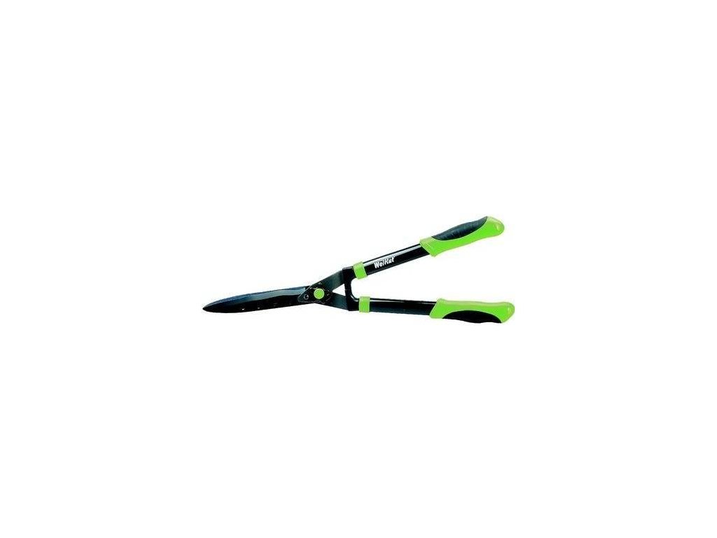 Hochwertige Heckenschere mit gebogener Klinge zum besseren Schneiden von jungen Trieben. Griffe aus Aluminiumrohr mit ergonomischen Griffen mit doppeltem Anti-Rutsch-Griff.