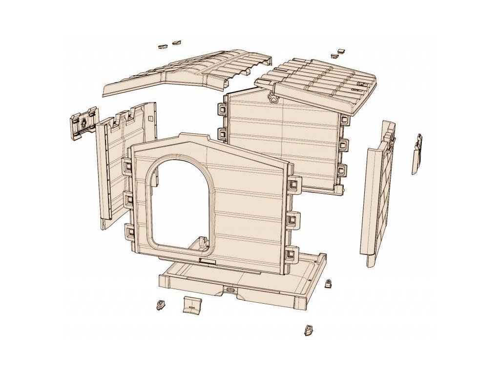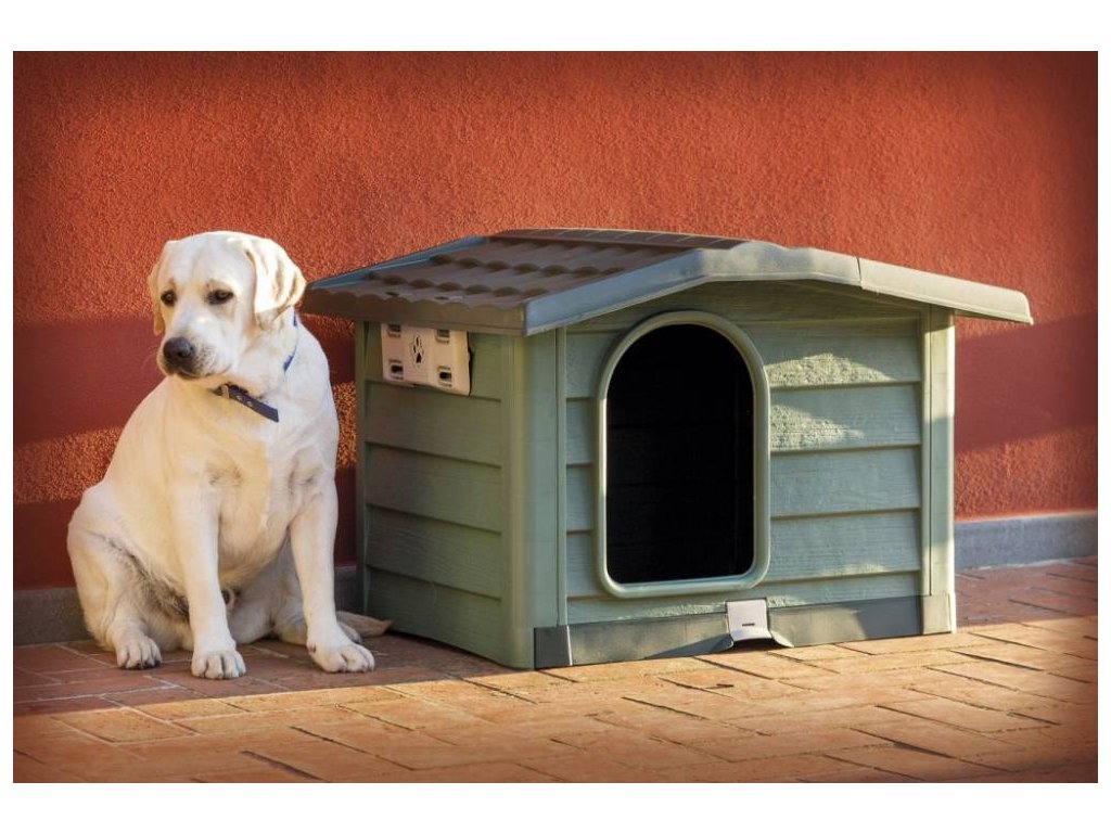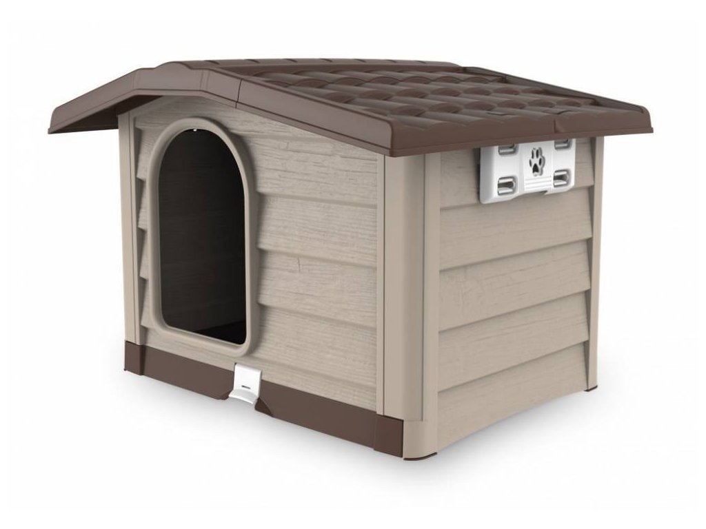 Hundehütte aus Kunststoff mit abnehmbarem Boden für eine einfache Reinigung und verstellbarem Dach in zwei Positionen für eine bessere Durchlüftung.