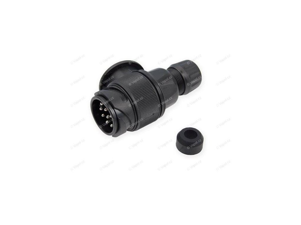 13-poliger/12V-Stecker für die Verkabelung der Anhängevorrichtung. Beinhaltet 2 Gummidichtungen, 1 Sicherungsring, 1 Kunststoffmutter, Schaltplan, Montageplan. Ausführung: schwarzer wetterfester Kunststoff