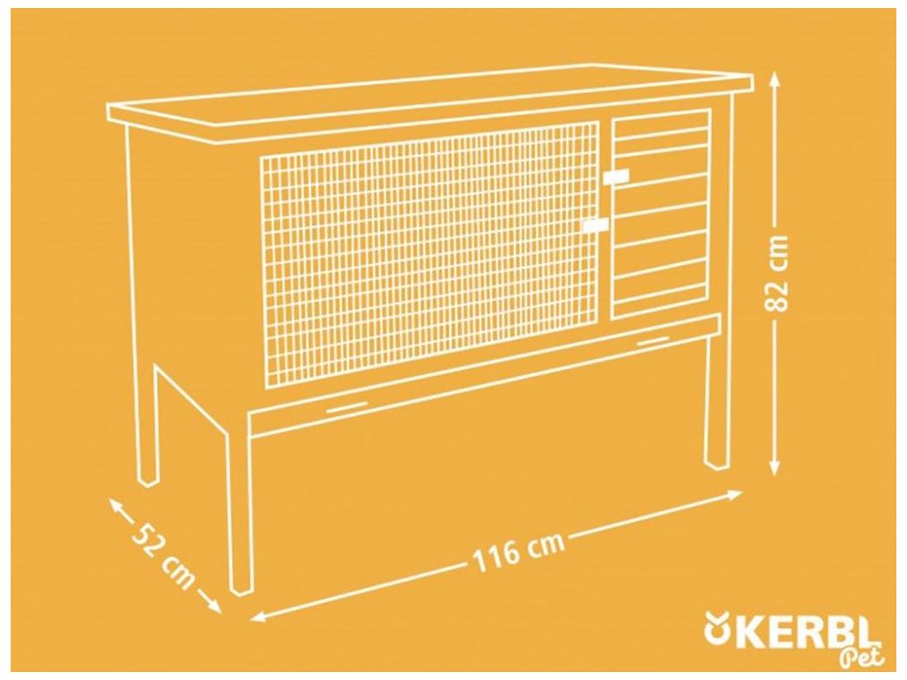 Die Außenmaße des gesamten Kaninchenstalls betragen 116x52x82 cm, die kleinste Innenhöhe des Stalls beträgt 50 cm und bietet somit Platz für ein Kaninchen, ein Zwergkaninchen, Meerschweinchen oder andere kleine Nager.