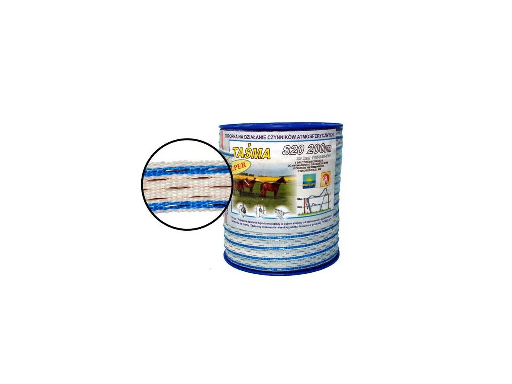 Leitfähiges Band mit erhöhter Leitfähigkeit mit 10 Leitern. Farbe weiß mit blauen Fasern. Zugfestigkeit 200 kg aufgrund der dickeren Fasern des Kunststoffträgers.