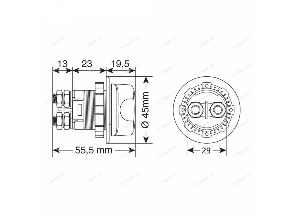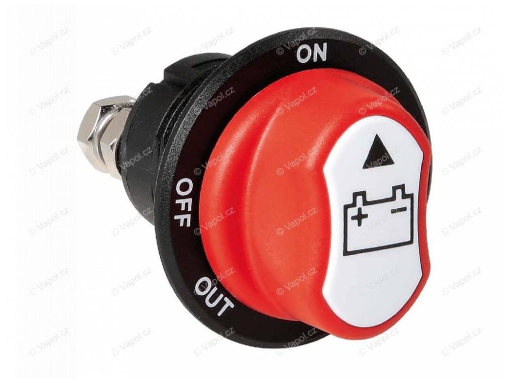 Kleiner Batterietrennschalter mit abnehmbarem Wählschalter. Drei Funktionen, ON, OFF, OUT. Schützt die Batterien vor Entladung bei längerem Nichtgebrauch.