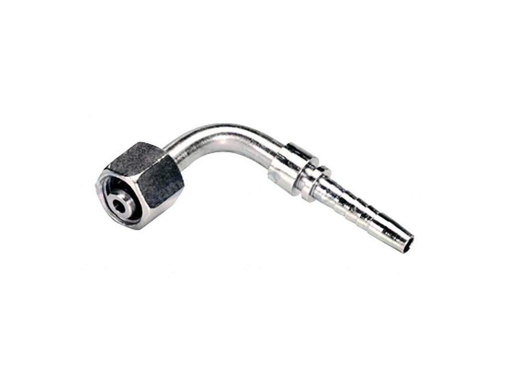 Pressnippel für die Herstellung von Hydraulikschläuchen mit metrischem Innengewinde M 14x1,5, Abdichtung nach DIN 24. Ausgelegt für Schläuche mit Innendurchmesser 1/4". Um 90 Grad gebogen.