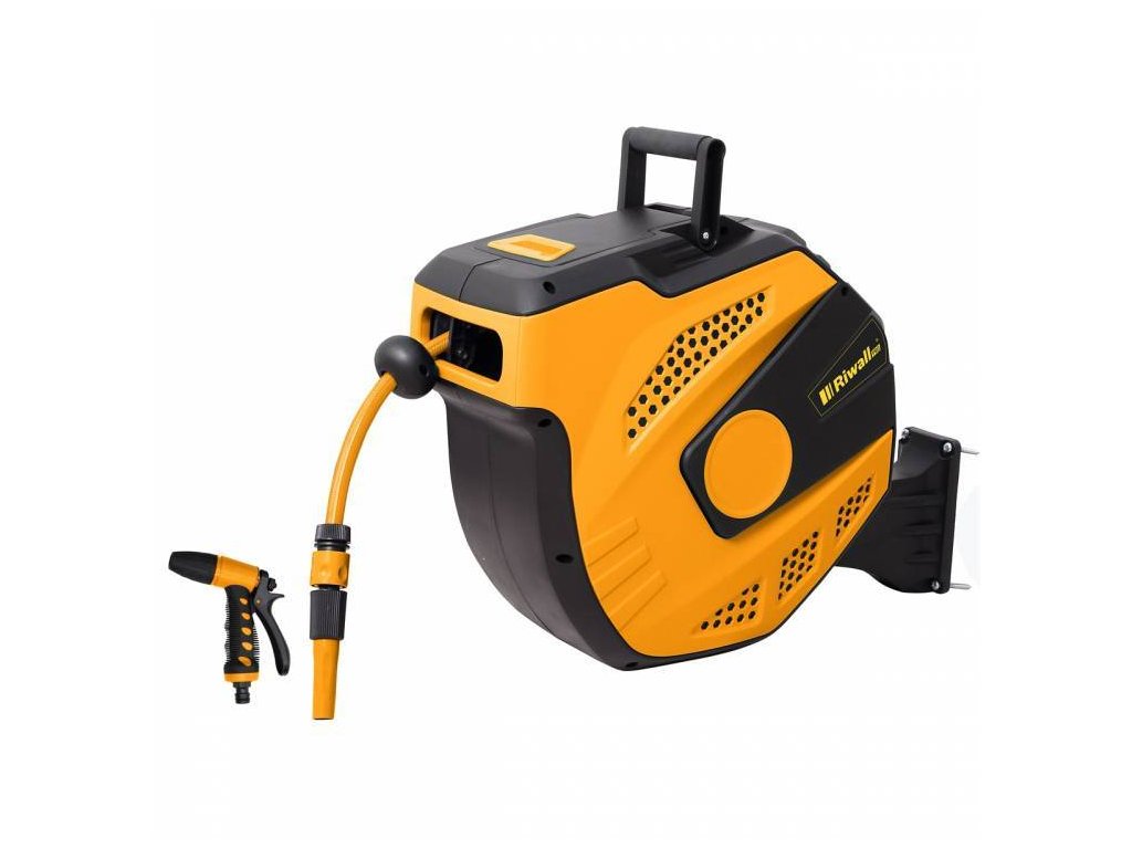 RWHR 27 SET - Selbstaufrollende Schlauchtrommel mit 27 m Gartenschlauch und ZubehörMit der praktischen automatischen Schlauchtrommel von Riwall können Sie Ihren Gartenschlauch im Garten, rund ums Haus oder in der Werkstatt einfach und bequem handhabenDank des stufenlosen Abroll- und Verriegelungssystems haben Sie immer einen ebenso langen Schlauch, Der Schlauch wird nach getaner Arbeit automatisch wieder in die Trommel eingezogen und ist somit frei von Unordnung und HindernissenDie Trommel lässt sich einfach an der Wand oder Decke befestigenDie gesamte Trommel ist um 180° um die vertikale Achse drehbar und bietet somit echte Bewegungsfreiheit auch auf großen FlächenDie Trommel dient auch als hervorragender Schutz für den Schlauch vor BeschädigungenDie Trommel lässt sich einfach aus der Halterung nehmen und mit dem integrierten Griff leicht transportieren (z.B. Die Trommel kann im Winter leicht in die Garage transportiert werden, usw.)Die mitgelieferten Kupplungen und zwei verschiedene Arten von Sprühern ermöglichen es Ihnen, das Produkt ohne weitere Investitionen sofort einzusetzenTechnische Parameter:Schlauchlänge (Ausgang): 25 mSchlauchlänge (Eingang): 2 mMaterial des Fasskörpers: PolypropylenDrehbare Trommel: Ja, 180°-BereichAutomatischer Schlauchaufzug: jaSchlauchverriegelung: jaMaterial des Druckschlauchs: PVAußenschlauchdurchmesser: 1/2 "Geeignet für Gewinde: 3/4 "Betriebsdruck: bis 10,3 barZubehör: klassisches Sprühgerät, Pistolensprühgerät, 2 KupplungenZusätzliche Parameter
