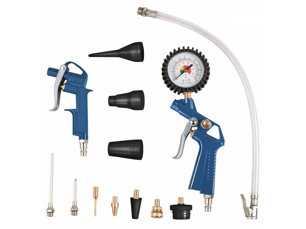 13-teiliges Kompressor-Zubehörset Basis-Zubehörset mit erweitertem Düsensortiment für das Aufpumpen von praktisch allen Werkzeugen aus Metalllegierung mit Schnellkupplungen Das Set enthält: Reifenfüllpistole mit Manometer mit Gummischutz, doppelter Skala (bar/PSI) und Auslösetaste Reifenablasspistole zum Reinigen oder Trocknen auch schwer zugänglicher Stellen 11 x Satz verschiedener Düsen und Schläuche für ReifenfüllpistoleZusätzliche Parameter