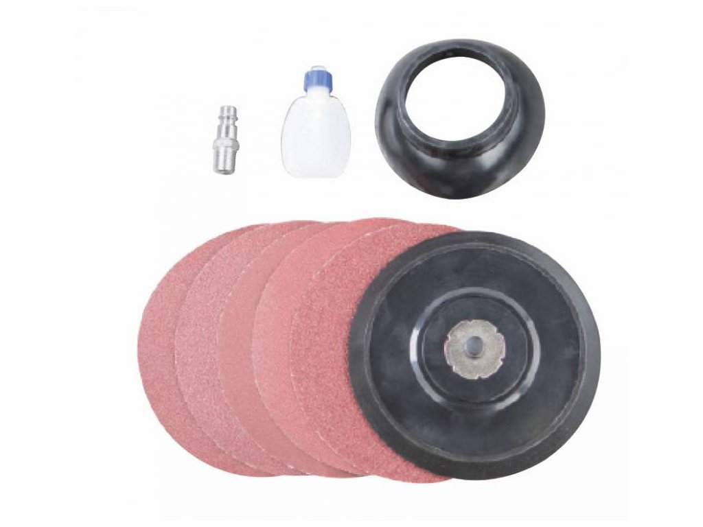 Druckluft-Exzenterschleifer 150 mm Exzenterschleiferset und Zubehör ideal zum Schleifen von Holz, Metallen, Kunststoffen, Farben und Fugenmassen und zum Polieren von Oberflächen Drehzahl: 10 000 U/min Maximaldruck 6,3 bar Luftverbrauch 93,4 l/min. 5 x Schleifpapier 150 mm, Schleifpad mit Klettverschluss, Dichtungsband, Schutzmanschette, Öler, Öl, SchnellkupplungsanschlussZusätzliche Parameter