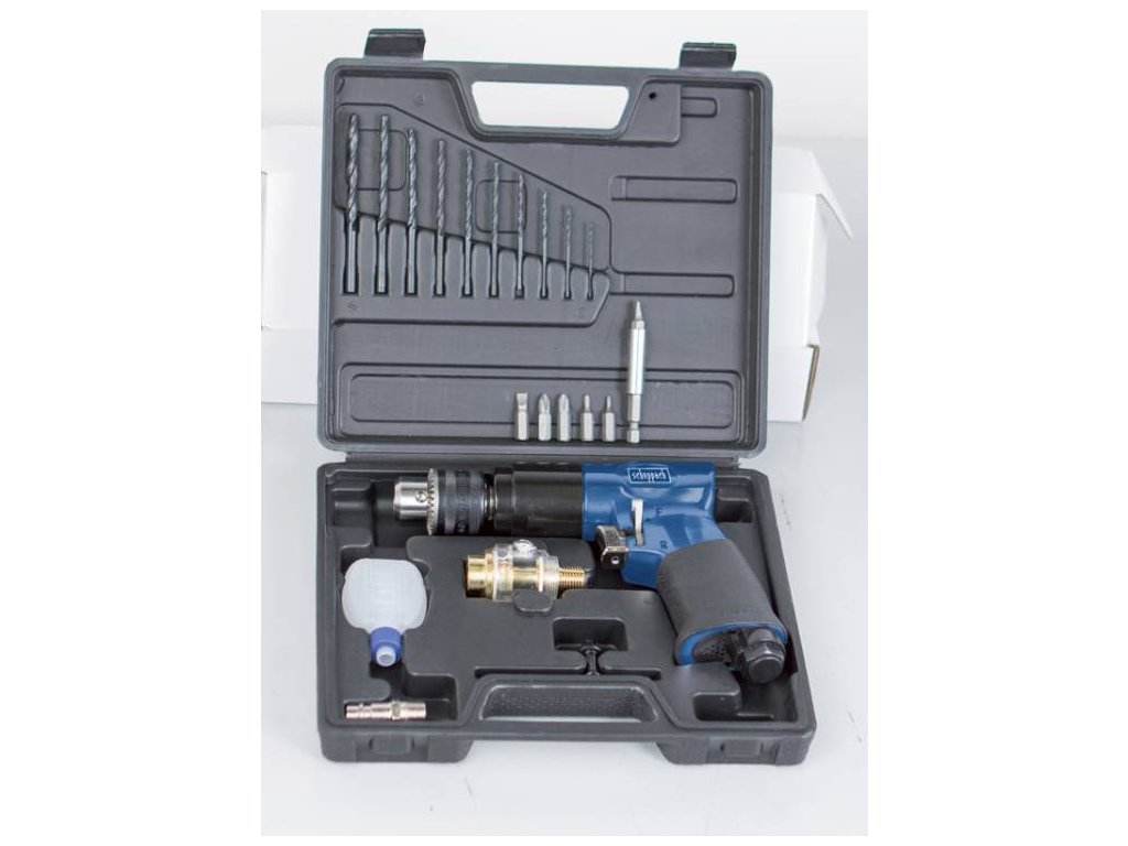 Druckluft-Schraubendreher 3/8" Schraubendreher- und Zubehörset im praktischen Koffer kompakt, leicht, mit beidseitiger Bedienung rutschfester Griff maximaler Druck 6,3 bar Luftverbrauch 141 l/min. Drehzahl: 1800 U/min max. Bohrerdurchmesser: 10 mm Zubehör: 10 x HSS-Bohrer, 6 x CrV-Bit, 1 x Bithalter, Öler, Öl, Spannfutter, Schnellkupplungsanschluss, Öl-LuftölerZusätzliche Parameter