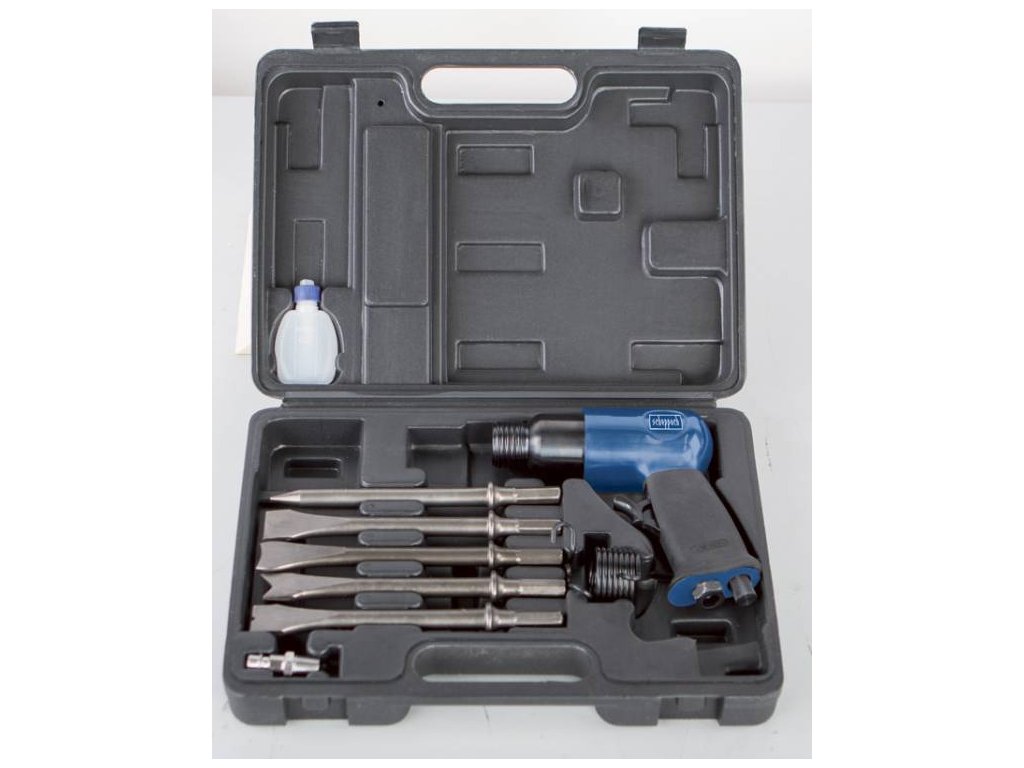 Presslufthammer Set aus Presslufthammer und Zubehör im praktischen Koffer ideal zum Schneiden von Fliesen, Herstellen von Nuten, Schlitzen und Durchbrüchen in Mauerwerk und Stein, Trennen von Blechen, Abschneiden von Nieten oder Muttern, Ausschlagen von Bolzen usw. 4500 Schläge pro Minute maximaler Druck 6,3 bar durchschnittlicher Luftverbrauch 79,2 l/min. Schaftdurchmesser: 10 mm Stahlkörper, rutschfester Griff Zubehör: 5 Meißel, Öler, Öl, Schnellkupplungsanschluss, KlemmfederZusätzliche Parameter