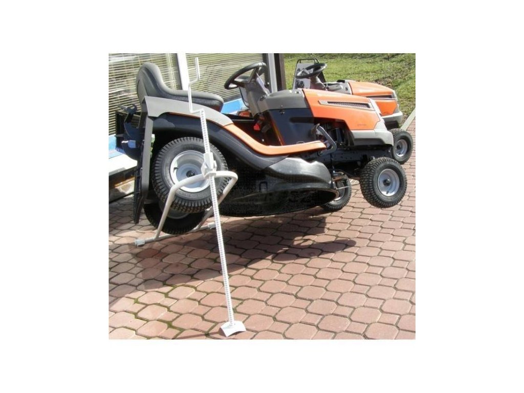 Diese Art von Wagenheber hebt den Gartentraktor an den Hinterrädern an. Das Anheben erfolgt durch eine hochfeste Schraube und Mutter. Die Seite des Traktors wird bis zu einer Höhe von 75 cm angehoben.