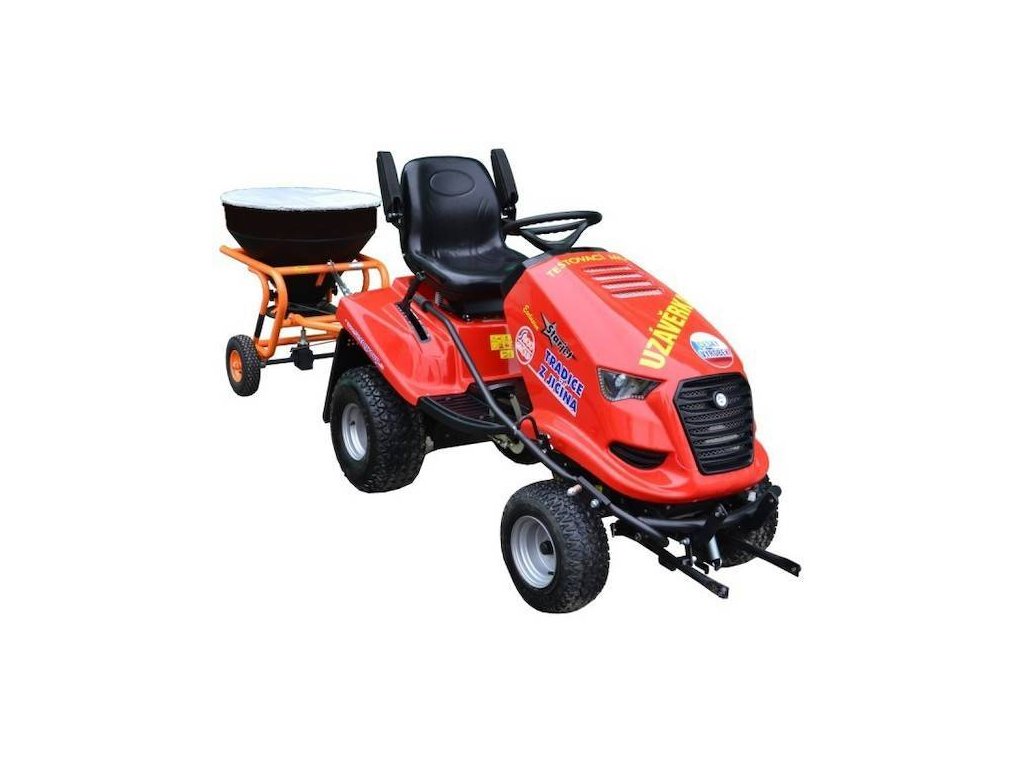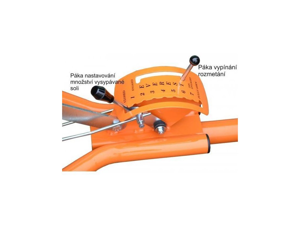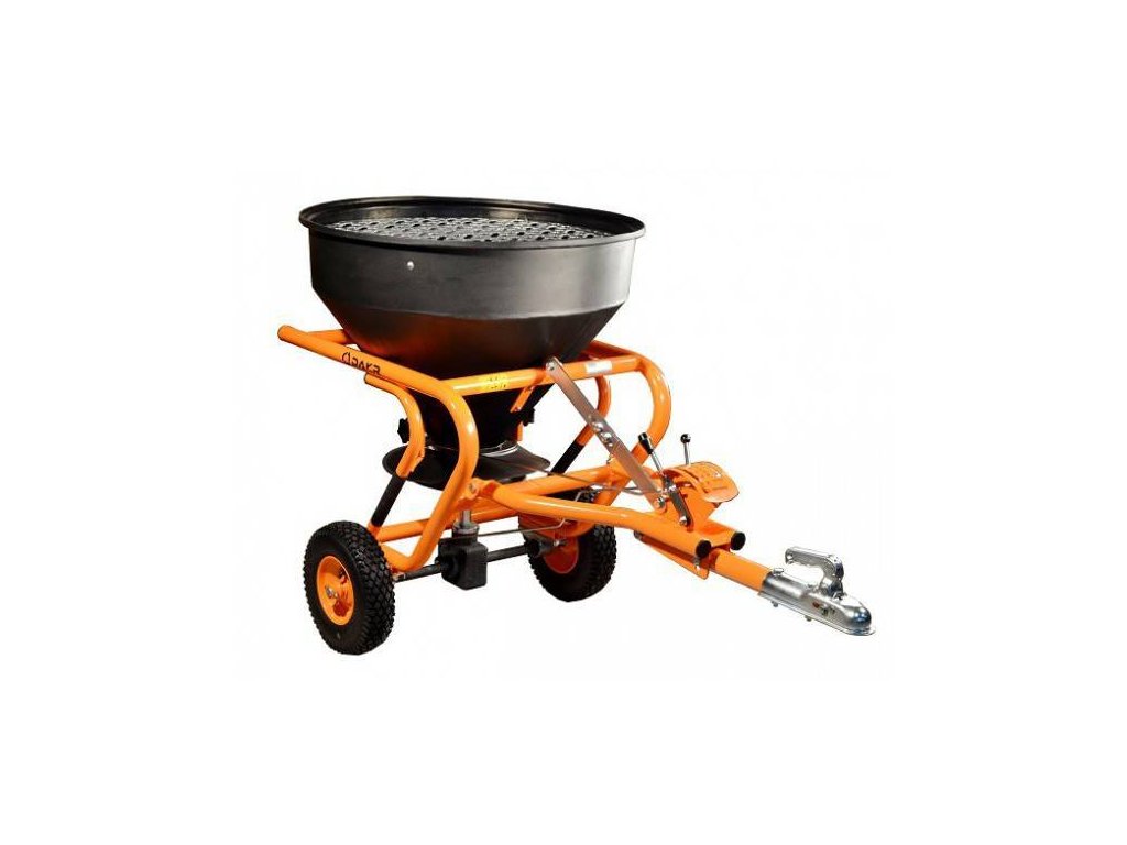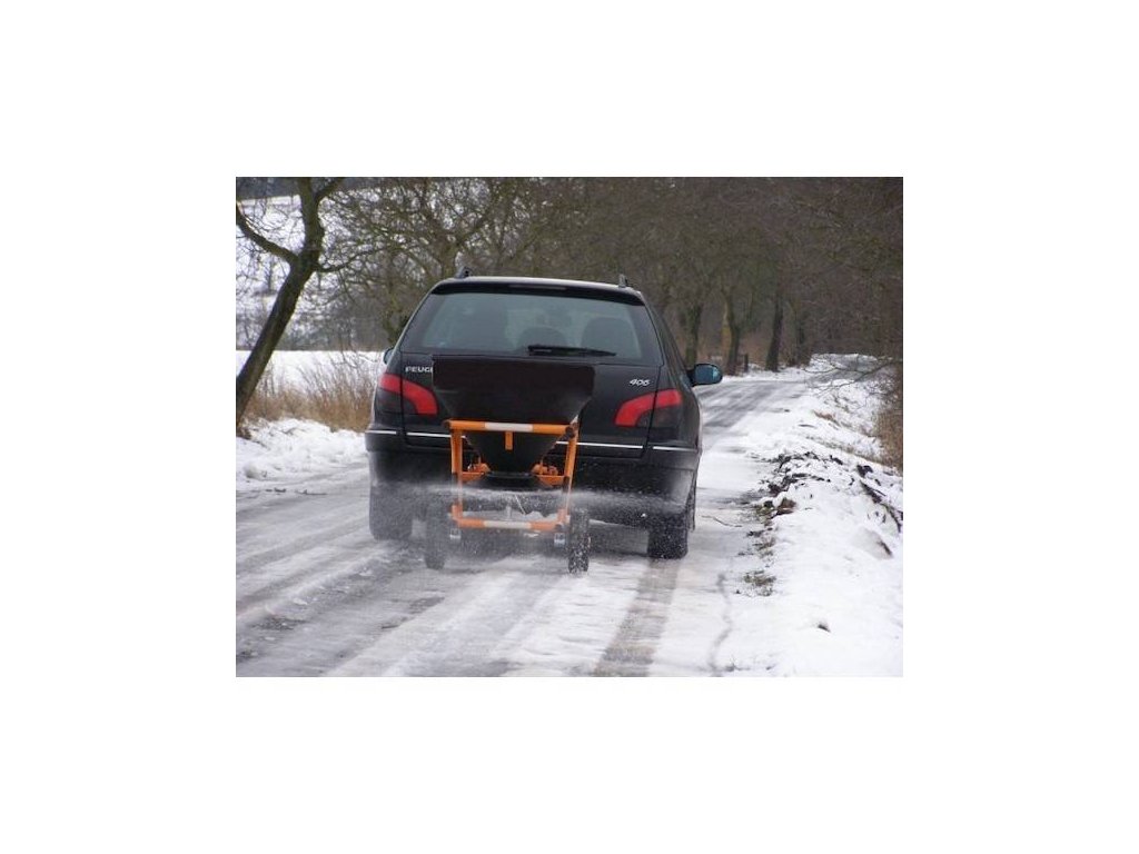 Gezogener Drehstreuer, Fassungsvermögen des Behälters 150 kg Salz, Arbeitsbreite 3-6 m.