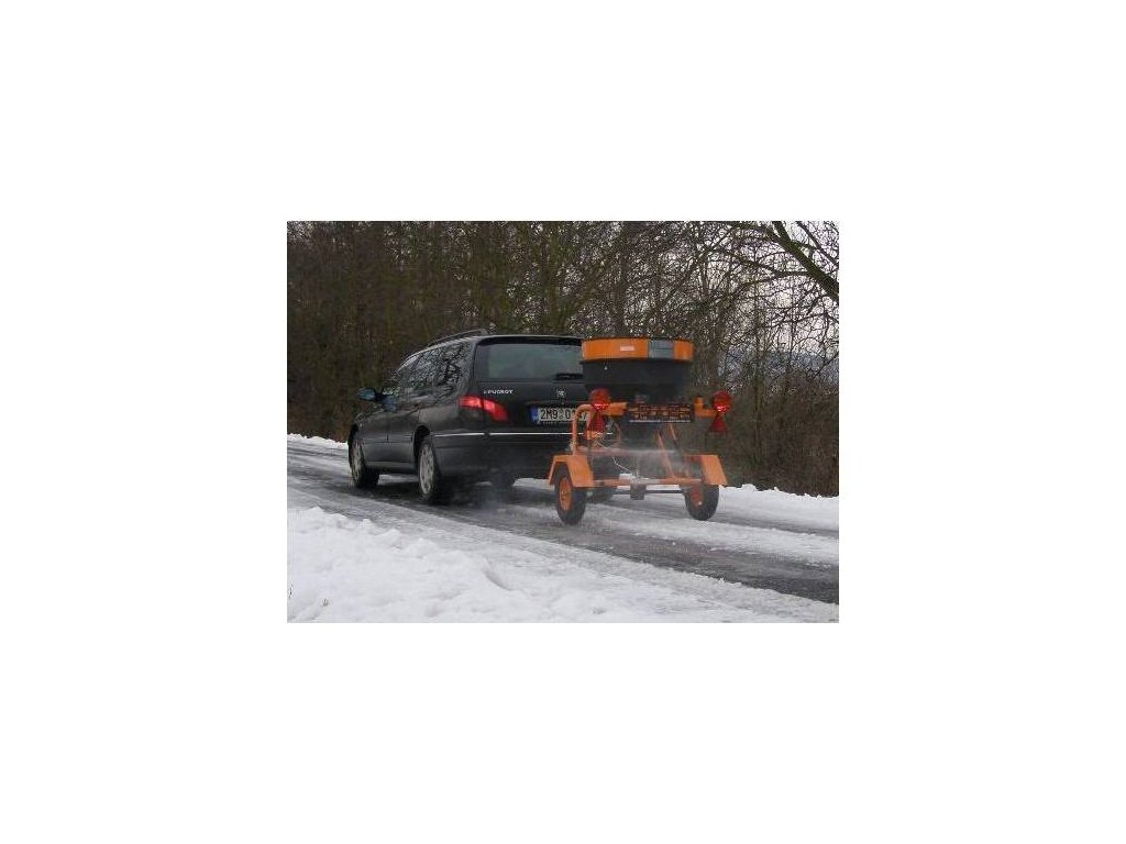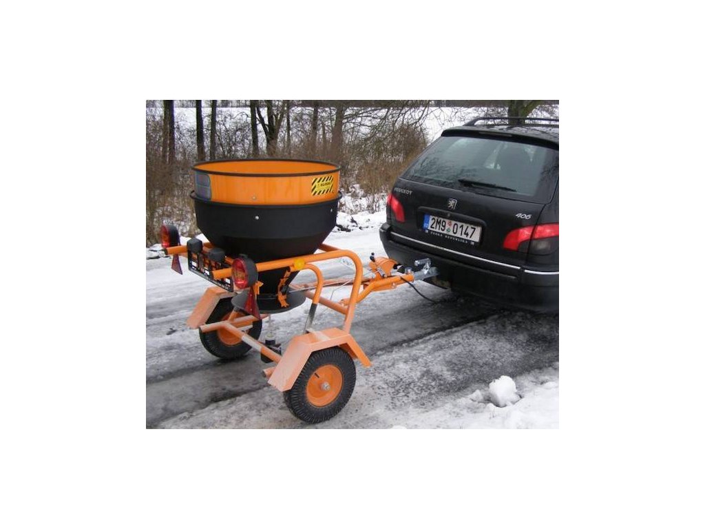 Gezogener Drehstreuer, 250 kg Fassungsvermögen des Salzbehälters, Arbeitsbreite 3-6 m. Getriebe mit Stahlkegelrädern.