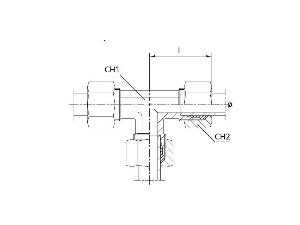 T-Kupplung für Hydraulikrohre mit 6 mm Durchmesser und 3x 6L-Kerbringverbindung.