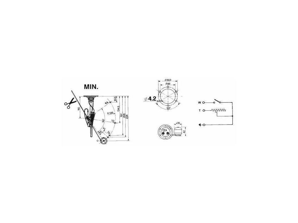 | Kalibrace: | Hladina paliva 0: 345-315 ohm, úhel otevření 0 ° -2 °; Hladina paliva 1/4: 228-185 ohm, 14 ° úhel otevření; Hladina paliva 4/4: |