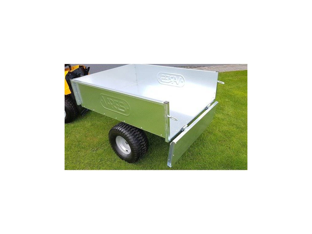 Eine absolute Neuheit auf dem europäischen Markt! Perfekter Oberflächenschutz durch Feuerverzinkung für Jahrzehnte! Mindestverzinkungsgewicht von 275g/m2 mit einem Muster aus sehr feinen Zinkblumen. Professionelle staubdichte Radnaben mit verstärkter 22mm Welle. Verstärkte Stahlrumpfstruktur mit Festigkeitsnieten, 1,5 mm Rumpfmaterialstärke, 3 mm Profilträgerstärke. Brandneues professionelles Scharniersystem an der hinteren Rumpfklappe. Doppelt geformte, abgerundete und perfekt glatte Rumpfkanten für eine einfache und sichere Handhabung. Kompatibel mit VARES-Anbaugeräten. Die Wagen werden mit montierter Achse geliefert, einfache und schnelle Montage der Räder mit vier Bolzen. Das Reifendesign ist sehr schonend für den Rasen.